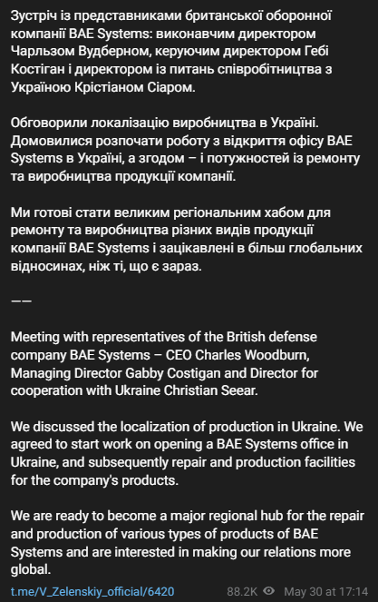 "Обговорили локалізацію виробництва в Україні. Домовилися розпочати роботу з відкриття офісу BAE Systems в Україні, а згодом - і потужностей з ремонту та виробництва продукції компанії", - заявив президент.