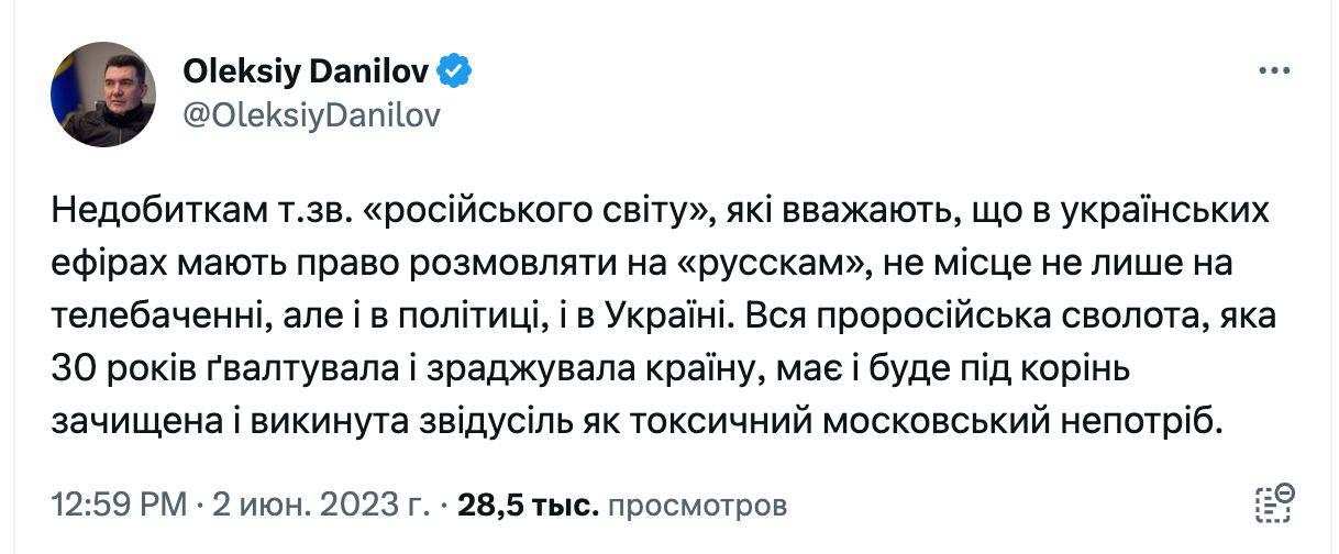 "Недобиткам т.зв. "російського світу", який вважає, що в українських ефірах мають право розмовляти "російською", не місце не тільки на телебаченні, а й у політиці, і в Україні. Вся проросійська сволота, яка 30 років насилувала зраджувала країну, має бути під корінь зачищена і викинута звідусіль як токсичний московський мотлох", - написав Данилов.