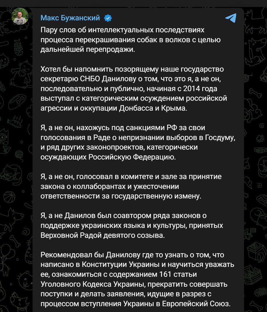 Максим Бужанський закликав секретаря РНБО "поважати сотні тисяч українських військовослужбовців та мільйони українських громадян, російськомовних, так само, як і сам Данилов, які є аж ніяк не меншими патріотами України, ніж він".
