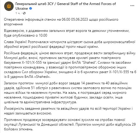 У понеділок, 5 червня, Генштаб ЗСУ оприлюднив зведення про ситуацію на фронті.