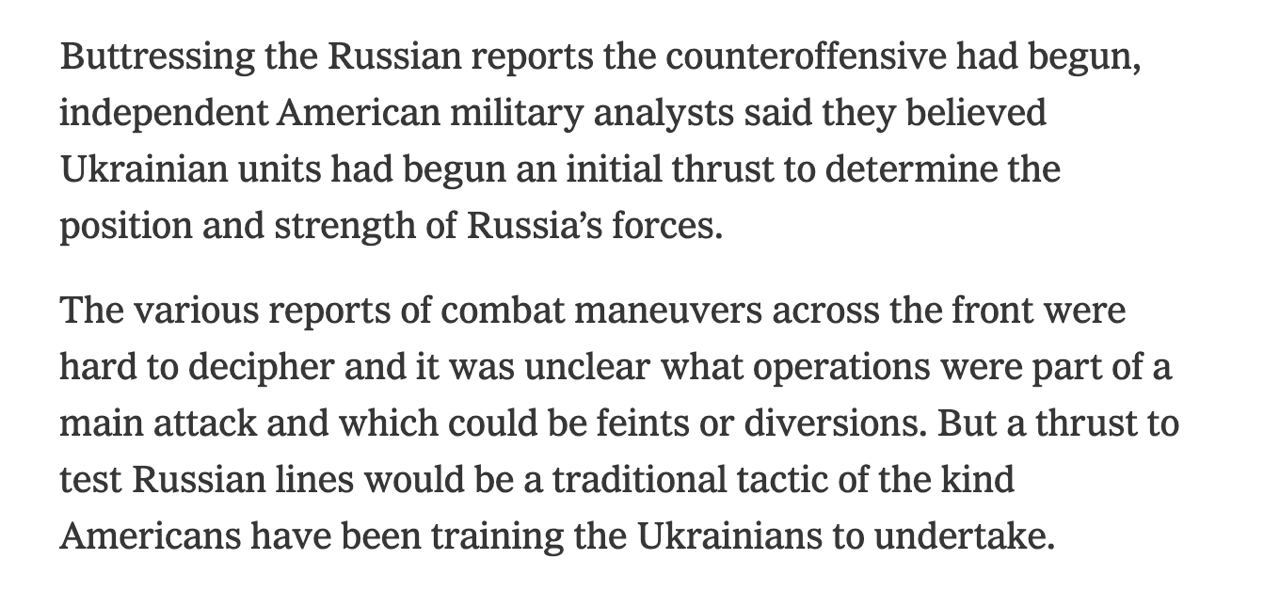 "Різні звіти про бойові маневри на фронті було важко розшифрувати, і було неясно, які операції були частиною головного удару, а які могли бути хитрощами або диверсіями. Але спроба перевірити позиції росіян буде традиційною тактикою, якою американці навчають українців", - пише видання.