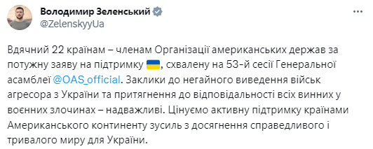 Зеленський висловив подяку 22 країнам-членам Організації американських держав за заяву на підтримку України. Заява, схвалена на 53-й сесії Генасамблеї організації, закликає негайно вивести війська агресора з України та притягнути всіх винних у військових злочинах до відповідальності.