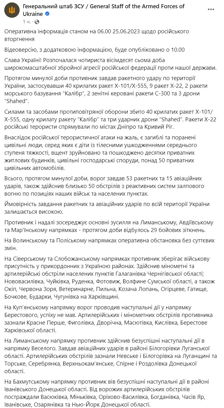 19:07 Свіже вечірнє зведення Генштабу ЗСУ.