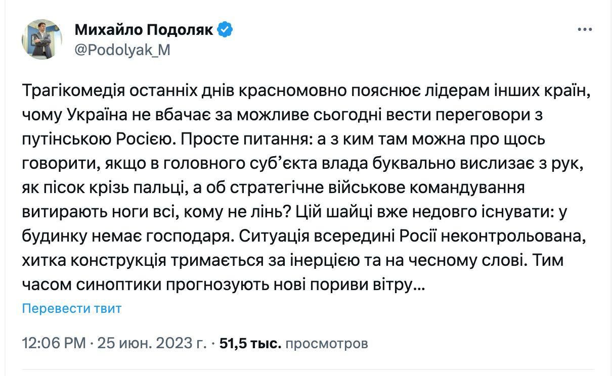 15:57 Заколот Пригожина показує, що вести переговори із нинішнім керівництвом РФ безглуздо, вважає радник глави Офісу президента Михайло Подоляк.
