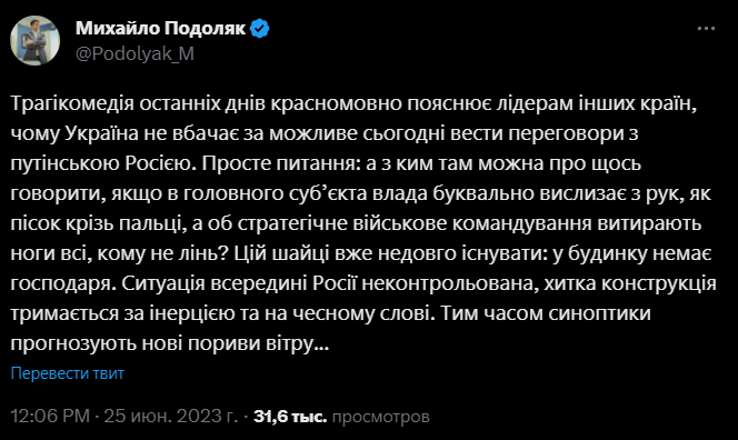Радник глави Офісу президента України Михайло Подоляк на тлі припинення заколоту Євгена Пригожина прокоментував, чому Україна не бачить можливостей переговорів із Росією.