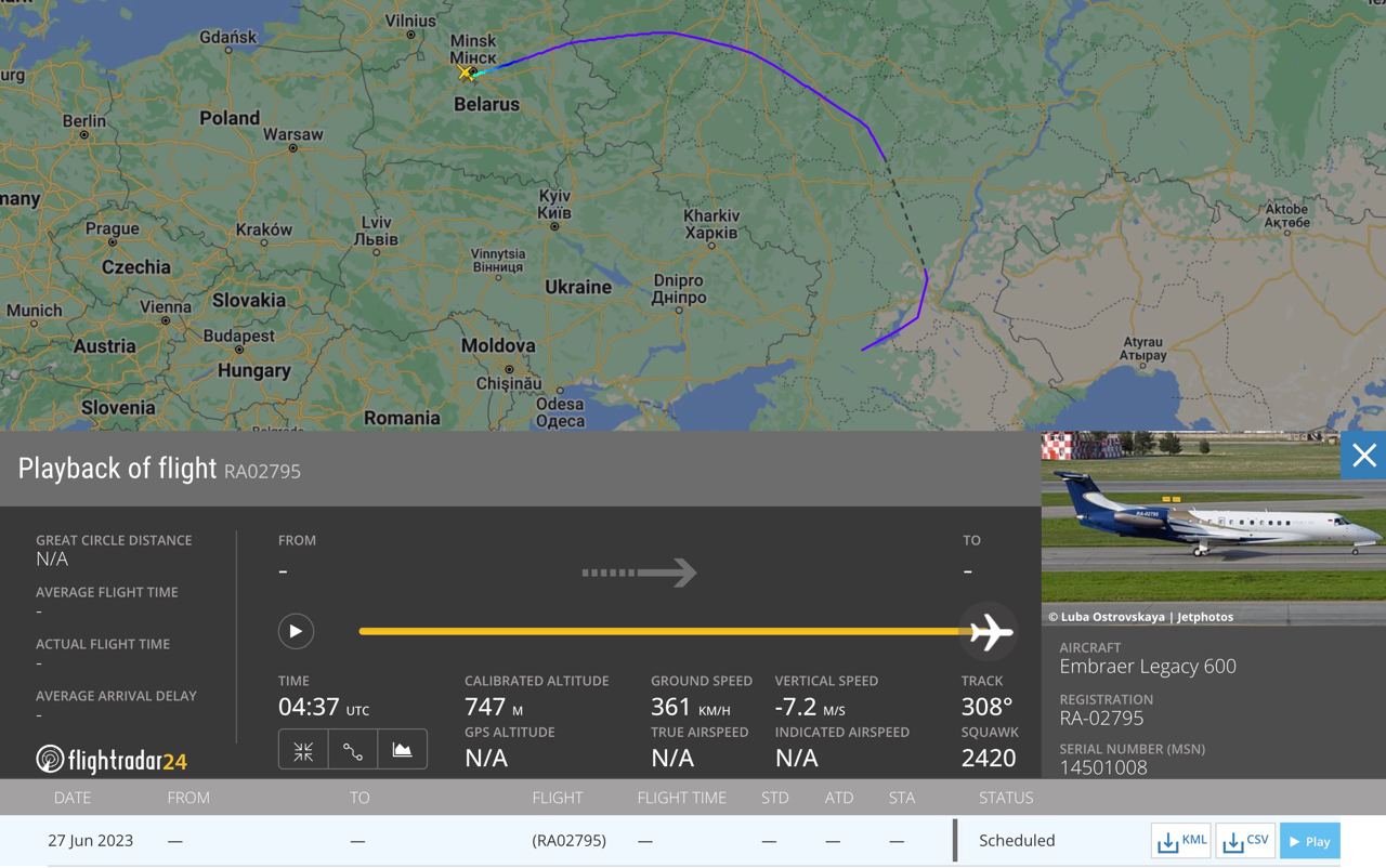 23.57 Бізнес-джет Пригожина вилетів із аеродрому Мачуліщі у бік Москви. Про це свідчать дані глобального сервісу Flightradar24.