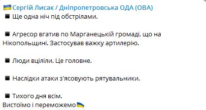 07.32 Вночі РФ вдарила з важкої артилерії по Марганецькій громаді на Дніпропетровщині. Обійшлося без постраждалих.