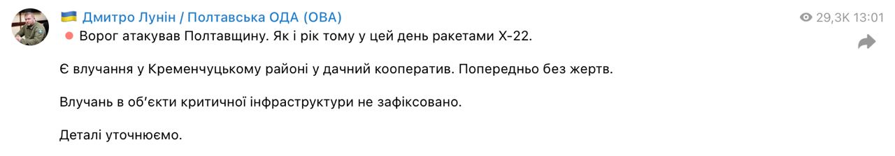 Голова Полтавської ОВА повідомив про приліт у дачний кооператив. Попередньо обійшлося без жертв. Попадань до об'єктів критичної інфраструктури не зафіксовано.