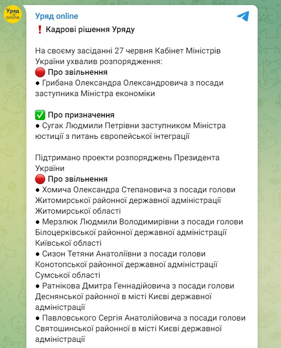 Крім того, Кабмін звільнив заступника міністра економіки України Олександра Грибана та кількох глав РДА в різних областях: