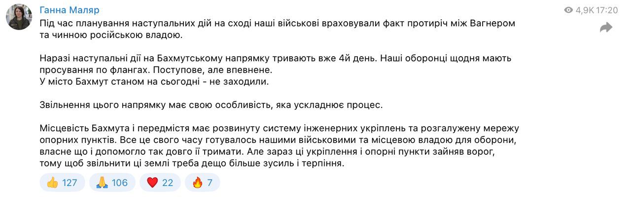 "Наші захисники щодня просуваються флангами. Поступово, але впевнено. У місто Бахмут станом на сьогодні не заходили", - написала Маляр.