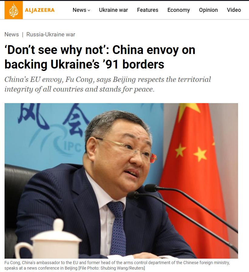 Відповідаючи на запитання Al Jazeera, чи підтримують Китай цілі України, включаючи повернення окупованих територій, Фу Цун сказав: