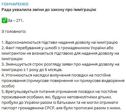 Верховна Рада внесла правки до закону про імміграцію в Україну. Нардеп Олексій Гончаренко повідомляє головні зміни у своєму телеграм-каналі: