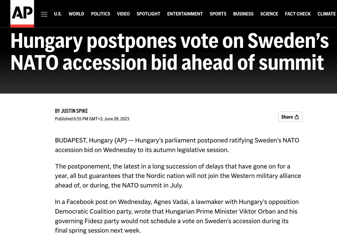 Парламент Угорщини відклав ратифікацію заявки Швеції на вступ до НАТО. Цього разу – до осені.