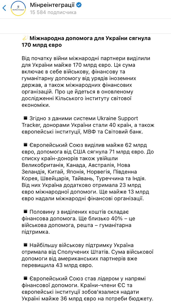 У цю суму входить військова, фінансова та гуманітарна допомога, виділена як окремими країнами, так і міжнародними організаціями.