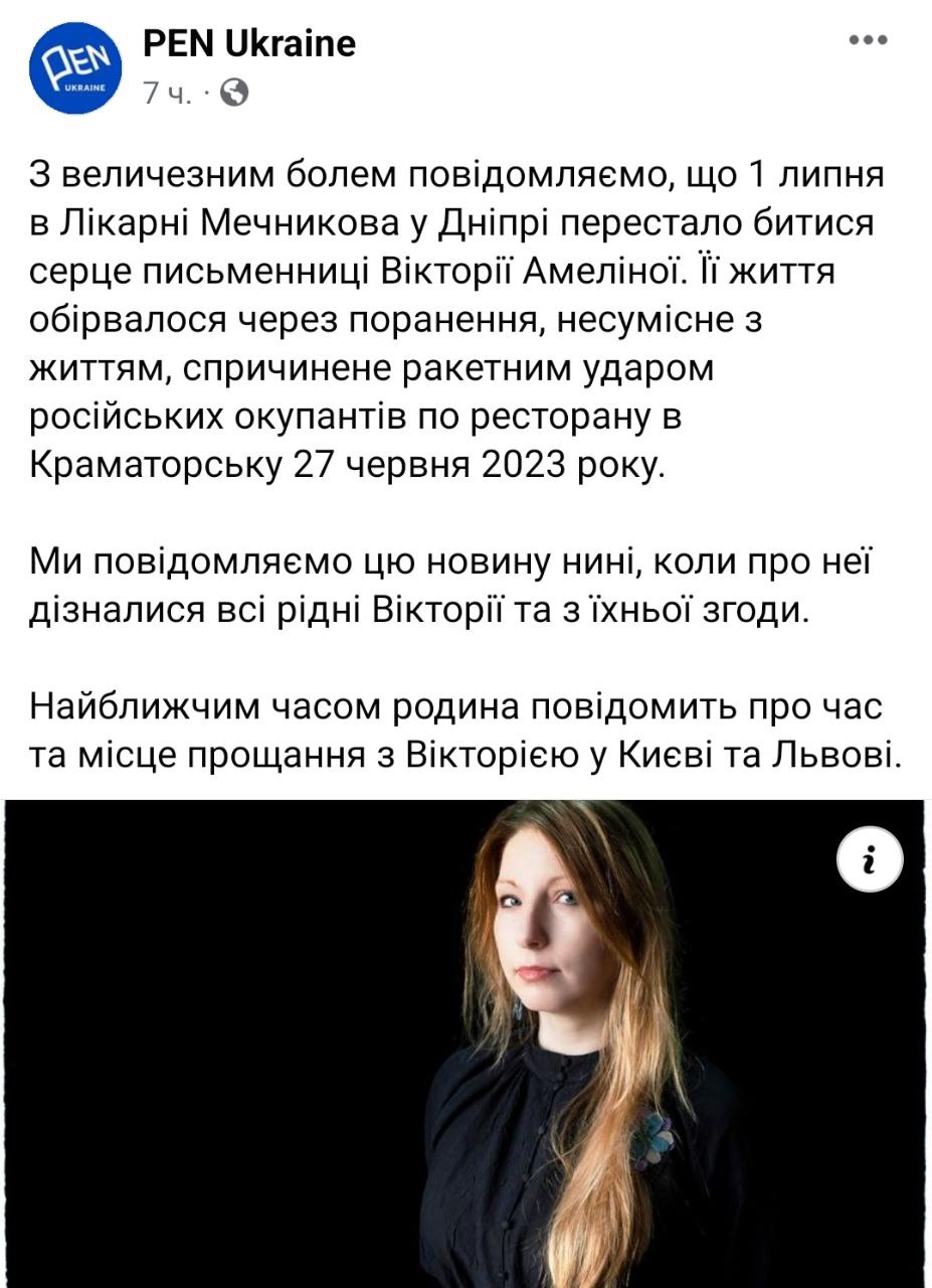 07.41 У піцерії Краматорська 27 червня загинула українська письменниця Вікторія Амеліна. Таким чином вона стала 13 жертвою ракетної атаки.