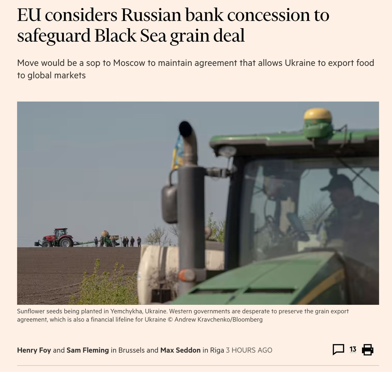 10:01 ЄС може дозволити Россельхозбанку, відключеному від SWIFT, створити дочірній банк з доступом до міжнародної системи розрахунків для продовження «зернової угоди», повідомляє Financial Times з посиланням на джерела.