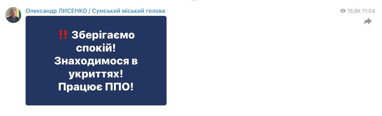 15.10 На Сумщині є загроза повторного удару дронами, попереджають Повітряні сили.