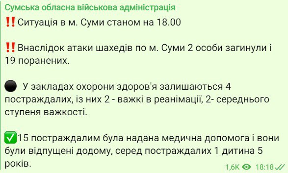 18:23 У Сумах внаслідок удару безпілотників уже двоє загиблих та 19 поранених.