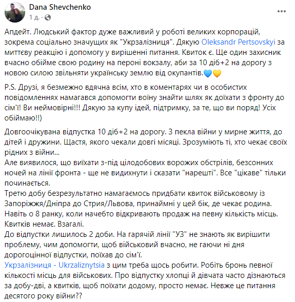 "Наше питання допомогло вирішити Олександр Перцовський (глава пасажирського напрямку "УЗ"). Квиток ми отримали. За що дуже вдячні! Однак у вільному доступі квитки із Запоріжжя чи Дніпра (провідні вокзали Півдня та Сходу для військових) у напрямку Львівської області (Львів, Івано-Франківськ, Тернопіль, Хмельницький), на жаль, не з'явилися (це питання назріло 9 років тому. Однак якщо раніше військові їхали на ротацію централізовано (підрозділами), то зараз ці короткі відпустки по 10 діб+2 на дорогу дають залежно від обстановки на фронті, і про повну ротацію підрозділу, як правило, не йдеться, тому потрібно персоналізувати вирішення питання, наприклад, як це вирішено з дітьми-інвалідами та їх супроводжуючими: навіть якщо немає у вільному доступі квитків, для них завжди є бронь на поїзд", - каже "Страні" Дана Шевченко.