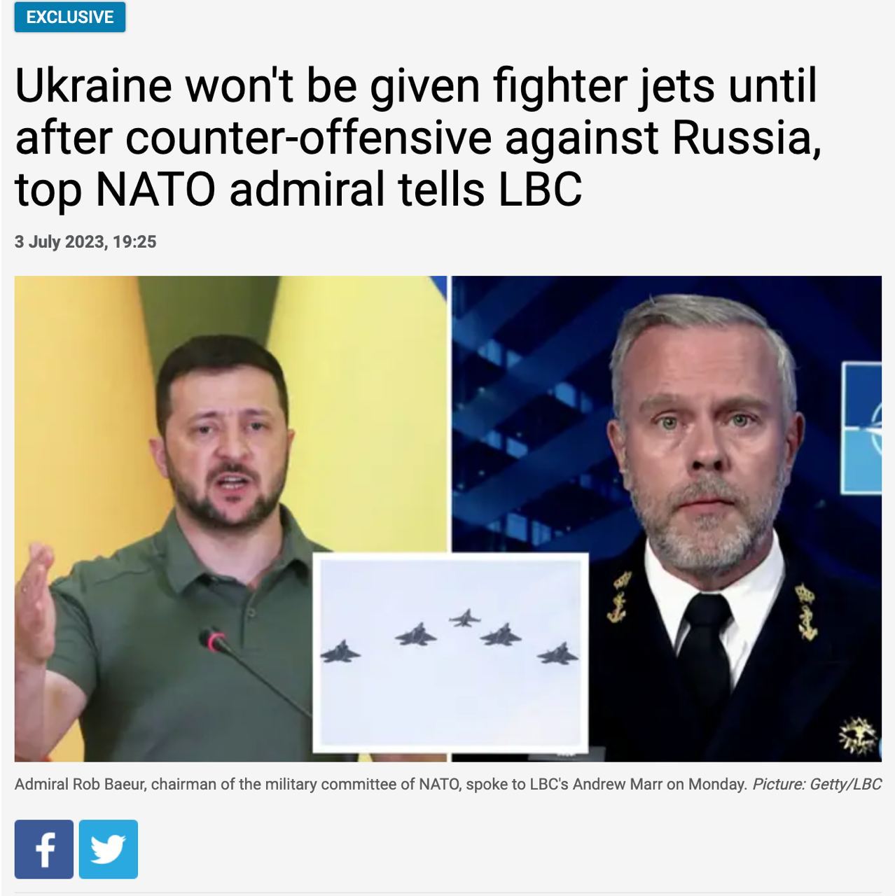 Раніше головком Залужний дорікнув західним союзникам, що ті штовхають його в наступ без авіації, хоча доктрина НАТО має на увазі перевагу в повітрі для початку наземних операцій глибокого проникнення.
