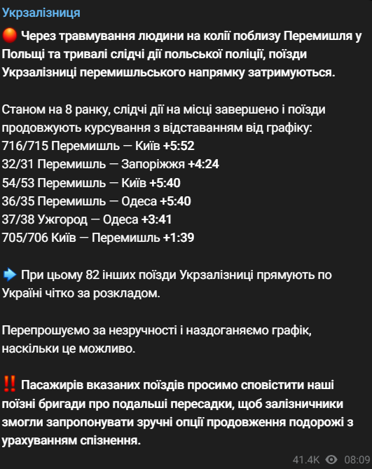 "Через травмування людини на коліях поблизу Перемишля у Польщі та тривалих слідчих дій польської поліції, потяги "Укрзалізниці" перемишльського спрямування затримуються", - йдеться у повідомленні.