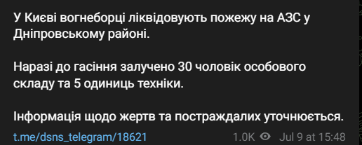 "У Києві пожежники ліквідують пожежу на АЗС у Дніпровському районі. Наразі до гасіння залучено 30 осіб особового складу та 5 одиниць техніки. Інформація про жертв та постраждалих уточнюється", - повідомляють у ДСНС.