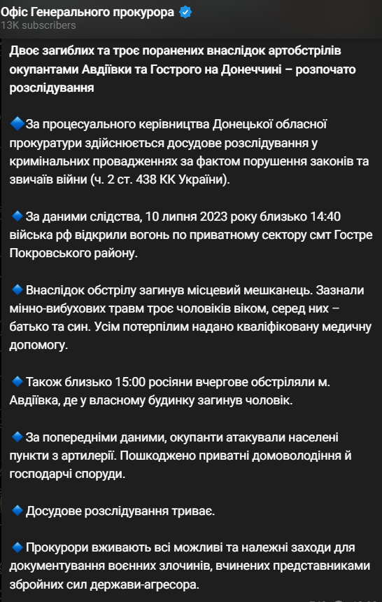 За даними слідства, близько 14.40 війська РФ відкрили вогонь по приватному сектору смт Гостро в Покровському районі. Внаслідок обстрілу загинув місцевий житель. Троє чоловіків, включаючи батька та сина, отримали мінно-вибухові травми.