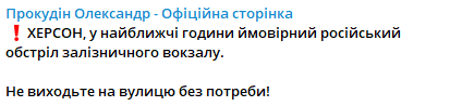 У вівторок, 11 липня, в Херсоні в найближчі години можливі російські обстріли залізничного вокзалу.