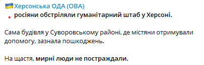 У вівторок, 11 липня, гуманітарний штаб у Херсоні було обстріляно з боку російських військових.