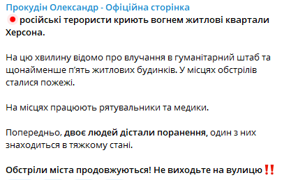 "У місцях обстрілів сталися пожежі. На місцях працюють рятувальники та медики. Попередньо, дві людини отримали поранення, одна з них перебуває у тяжкому стані. Обстріли міста тривають! Не виходьте на вулицю", - написав Прокудін.
