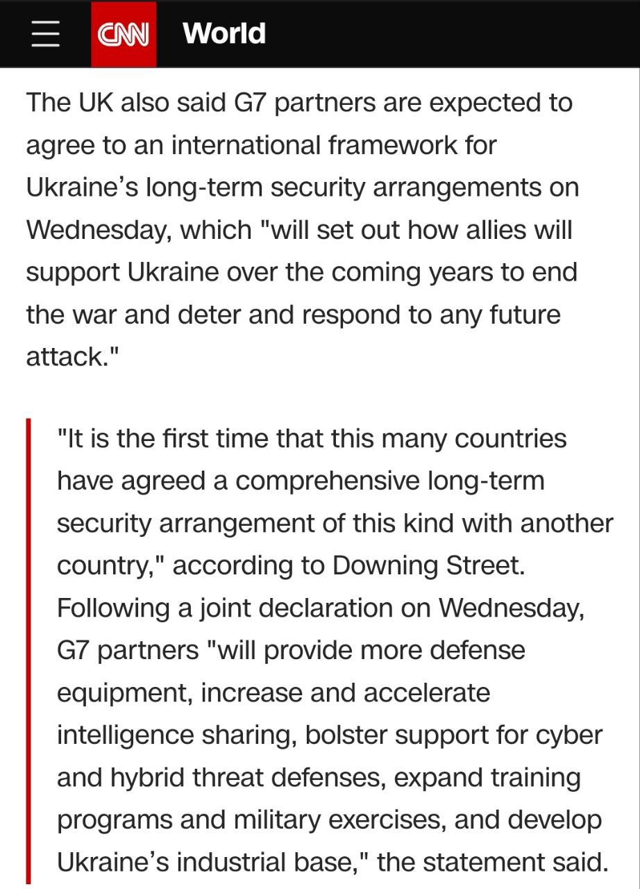 "Сьогодні ми розпочинаємо переговори з Україною з метою формалізації – через двосторонні зобов'язання щодо безпеки та домовленості, узгоджені з цією багатосторонньою рамковою угодою, згідно з нашими відповідними правовими та конституційними вимогами – нашої незмінної підтримки України, яка захищає свій суверенітет та територіальну цілісність економіку, захищає своїх громадян і прагне до інтеграції до євроатлантичної спільноти. Ми доручимо нашим командам негайно приступити до цих дискусій", - йдеться у декларації.