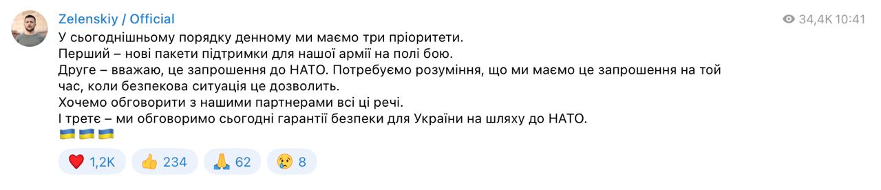 "Зустріч не менш ніж удвічі довша за заплановане, і саме така змістовна, як треба. Якби протокол не зупинив зустріч, ми б говорили ще довше. Усі теми: тривала підтримка, зброя, політика, НАТО. Виразно бачимо, як завершити цю війну нашій спільною перемогою", – написав український президент у своєму телеграм-каналі.