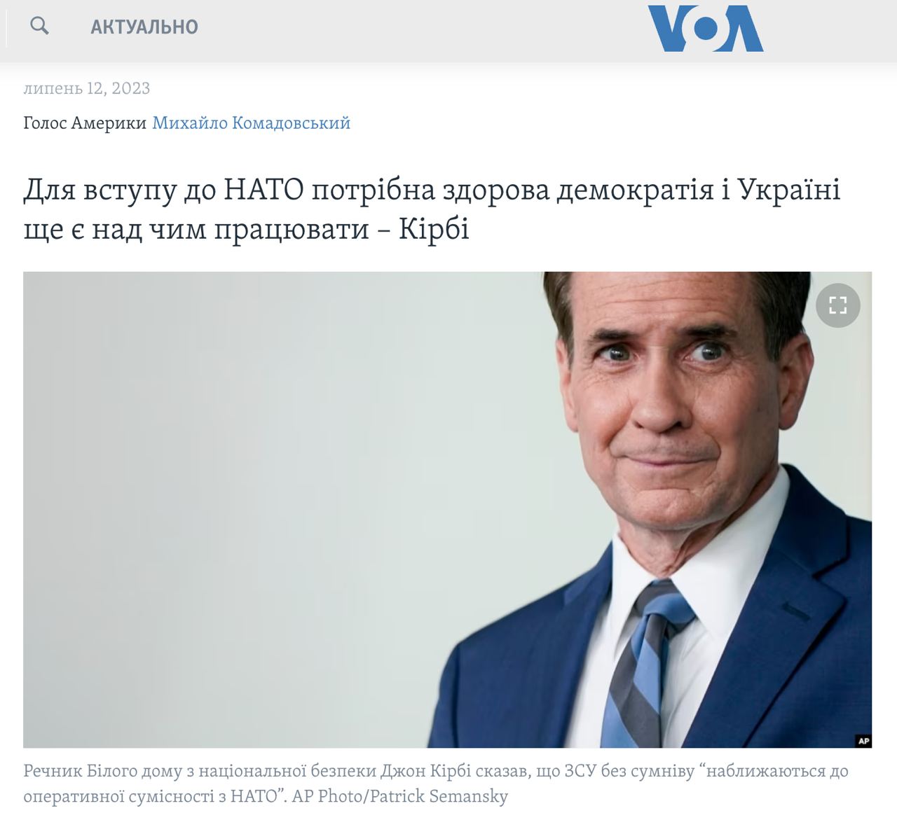"Ми маємо пам'ятати, що українці воюють і гинуть за свою країну. І маємо зосередитися на тому, щоб допомогти їм досягти успіху. Потім ми визначимо шлях для можливого членства в НАТО, який дасть Україні час і простір для роботи над деякими реформами, в той же час. ж час маючи зобов'язання та гарантії безпеки від Заходу", – додав Кірбі.