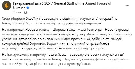 Сили оборони України продовжують вести наступальну операцію на Бахмутському, Мелітопольському та Бердянському напрямах.