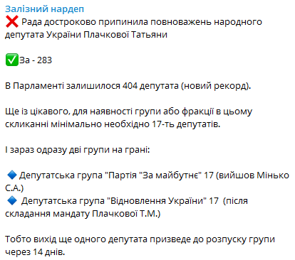 Рішення підтримали 283 депутати. Після складання мандата Плачкової в парламенті залишилися повноважними 404 депутати із 450.