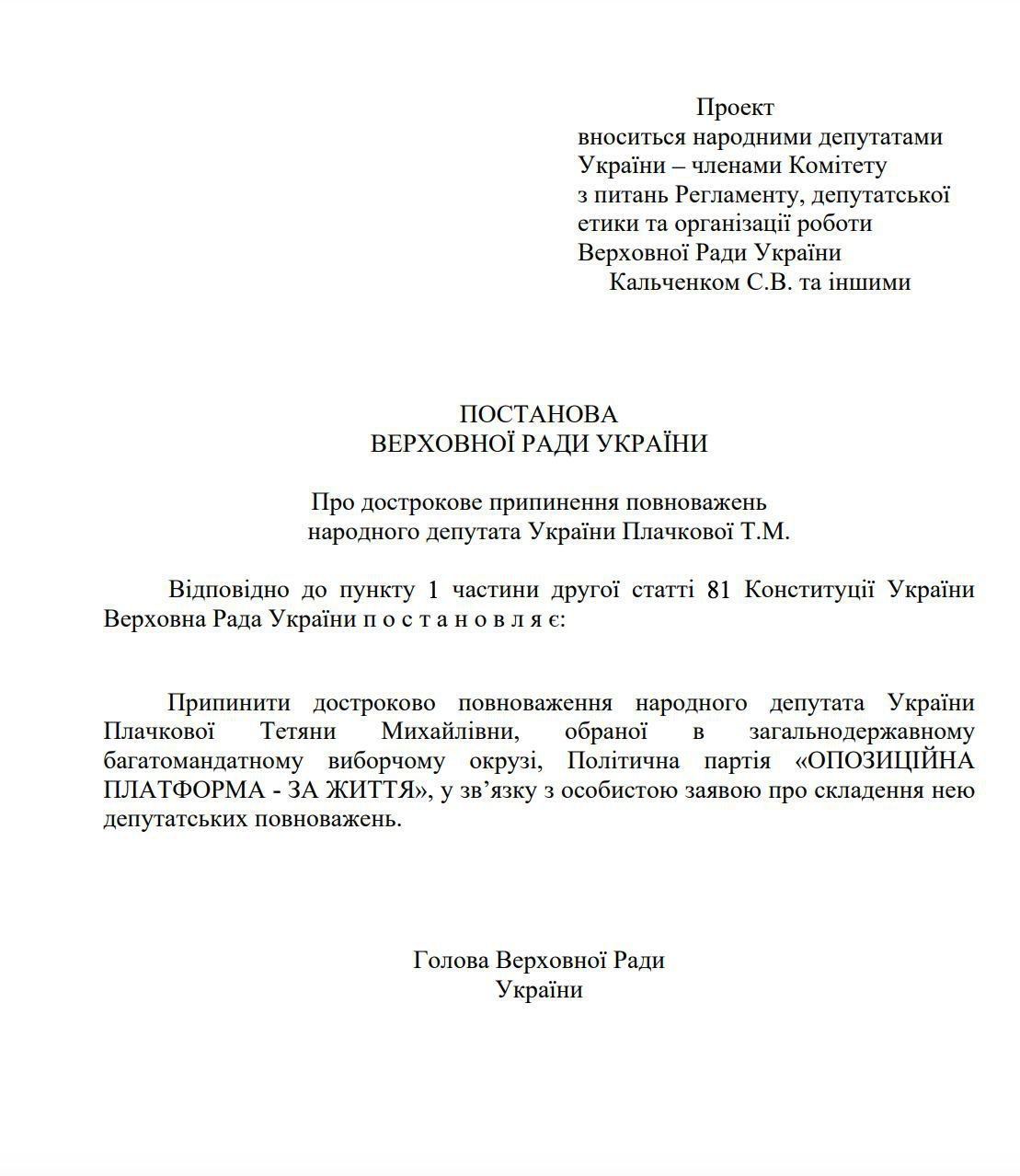 Верховна Рада достроково припинила повноваження нардепа від забороненої партії "ОПЗЖ" Тетяни Плачкової. Напередодні вона подала заяву про складання мандату.