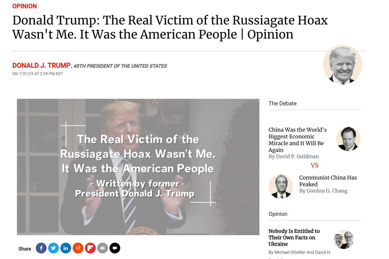 У статті політик також пише, що це розслідування зблизило РФ і Китай, і називає його кампанією з дискредитації, відповідальність за яку покладає на лідерів Демократичної партії: Гілларі Клінтон, Барака Обаму та Джо Байдена.