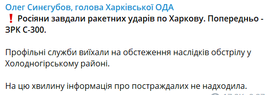 09:34 У Харкові під удар потрапив Холодногірський район, повідомив голова Харківської ОВ Олег Синегубов.