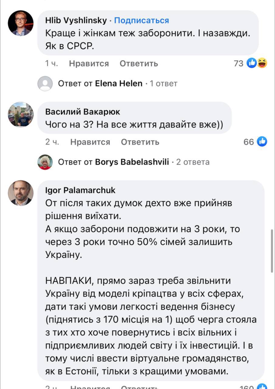 Також коментатори вважають, що замість заборон, які лише посилять ситуацію, треба мотивувати людей не виїжджати із країни.