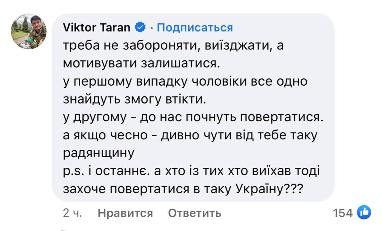 "Потрібно не забороняти, виїжджати, а мотивувати залишатись. У першому випадку чоловіки все одно знайдуть можливість втекти. У другому – до нас почнуть повертатися", - пише Віктор Таран.