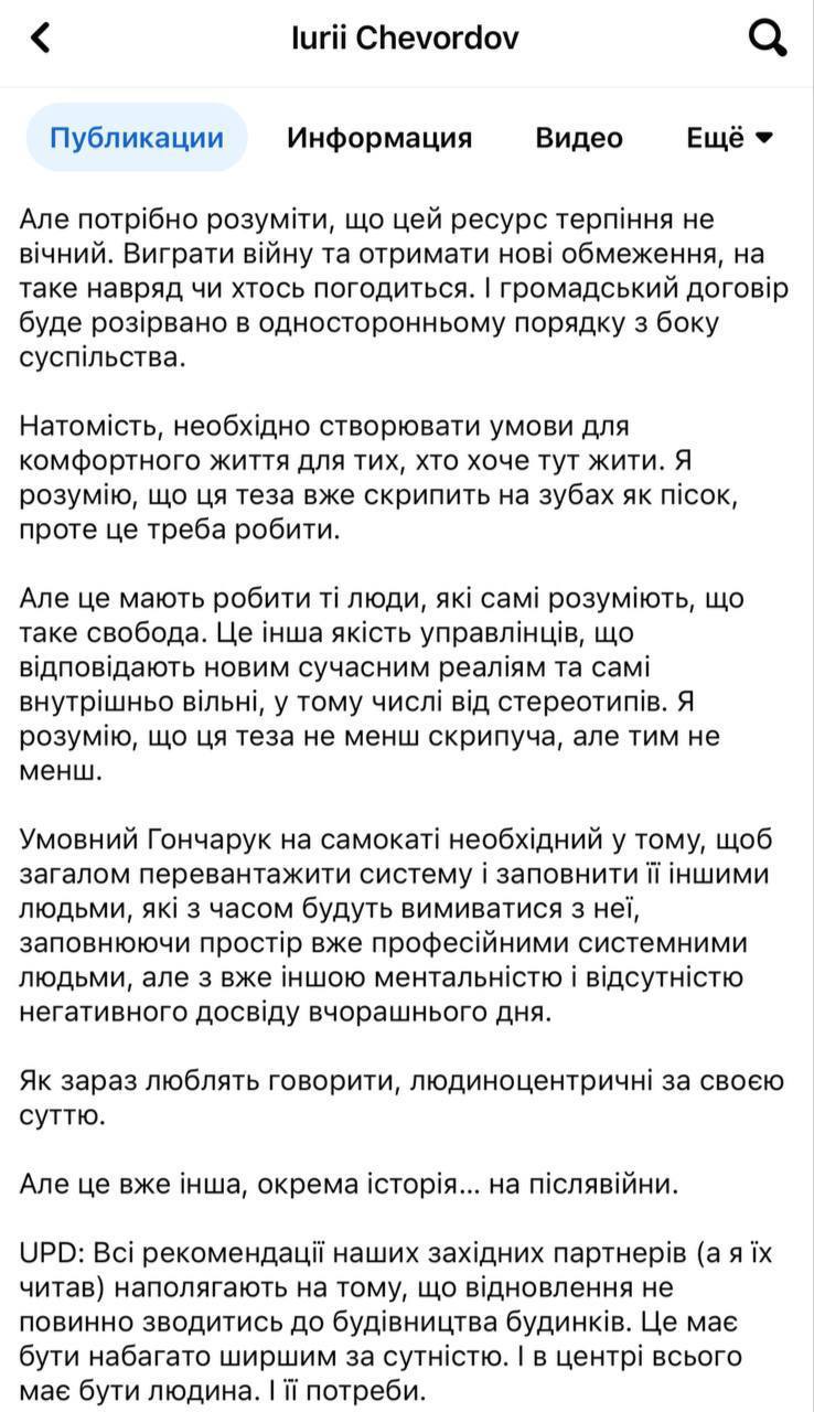 "Тому що зараз менше зло. Але треба розуміти, що цей ресурс терпіння не вічний. Виграти війну та отримати нові обмеження на таке навряд чи хтось погодиться. І громадський договір буде розірваний в односторонньому порядку з боку суспільства. Натомість необхідно створювати умови для комфортного життя для тих, хто хоче жити тут", - пише Юрій Чевордов.