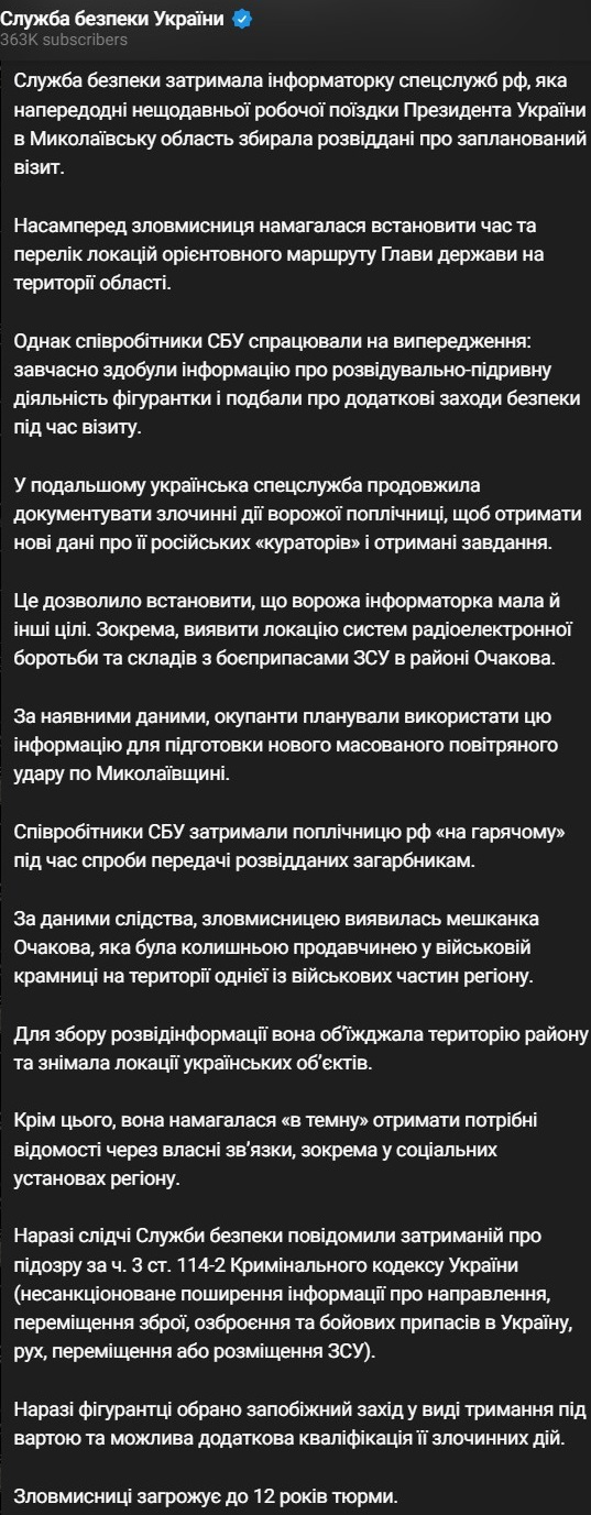 СБУ повідомляє, що заздалегідь отримала інформацію про підготовку замаху та вжила додаткових заходів безпеки під час візиту, а сама продовжила документувати дії жінки та затримала її "при спробі передачі розвідданих до РФ".