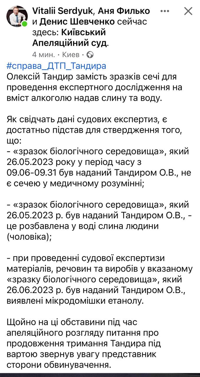 Суддя Олексій Тандир, підозрюваний у скоєнні п'яної ДТП із летальним кінцем, для експертизи на алкоголь замість зразків сечі надав слину та воду.