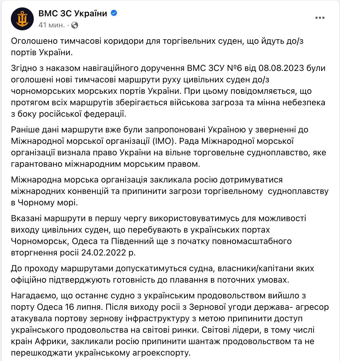 Зазначені маршрути насамперед використовуватимуться для можливості виходу цивільних суден, які стоять у портах Чорноморськ, Одеса та Південний ще з початку вторгнення.
