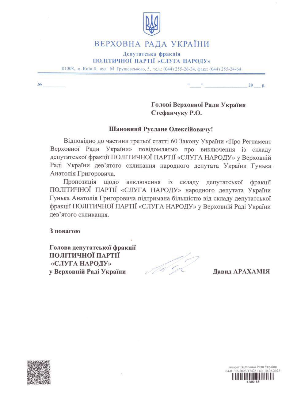 "Слуги народу" виключили зі своєї парламентської фракції народних депутатів Анатолія Гунька та Богдана Торохтія.