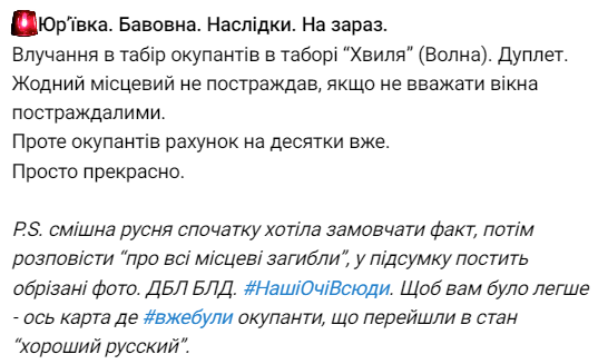Незабаром у ЗСУ підтвердили удар по Юріївці. Стратком заявив, що було вражено командний пункт військ РФ у санаторії "Хвиля".