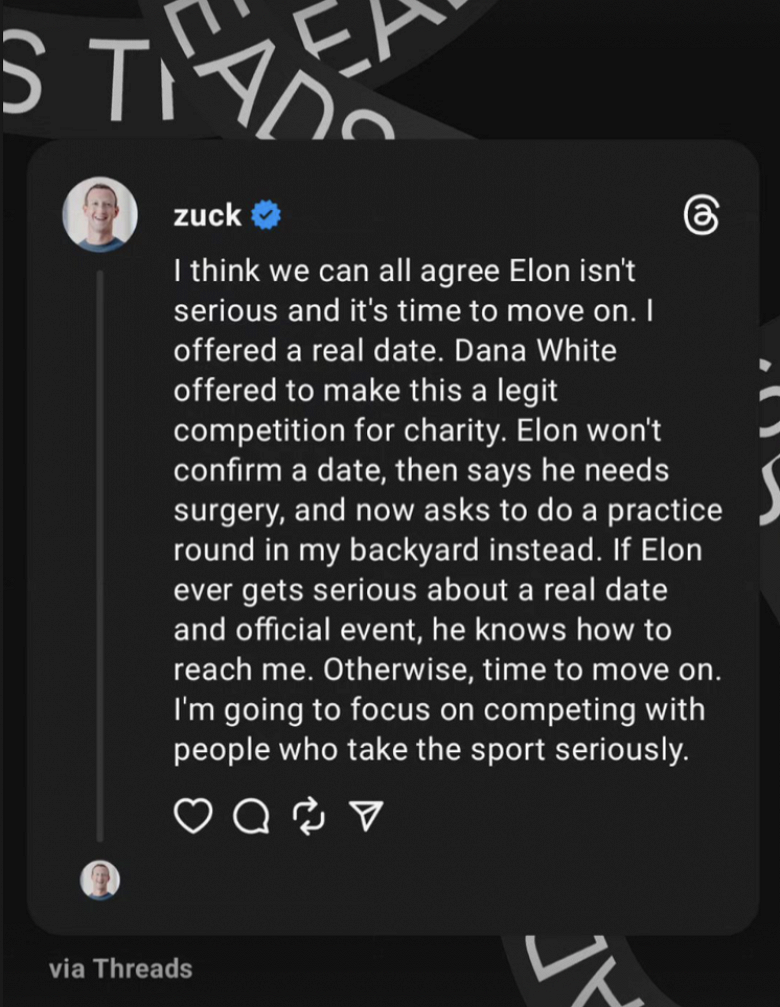 "Я запропонував справжній бій. [Президент UFC] Дана Уайт запропонував зробити це офіційним благодійним змаганням. Ілон не підтвердив дату [бою], потім заявив, що йому потрібна операція, а тепер просить провести тренування на моєму задньому дворі", - сказано у пості. Цукерберг.