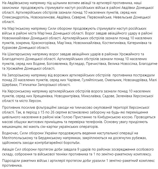1. ЗСУ продовжують наступальні операції на Мелітопольському та Бердянському напрямах, закріплюються на досягнутих рубежах.