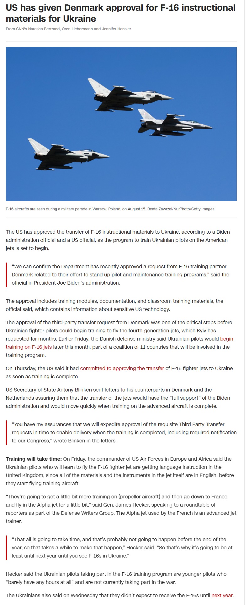 "Можемо підтвердити, що Міністерство оборони нещодавно схвалило запит від країни-партнера щодо навчання на F-16, Данії, пов'язаний з їхніми зусиллями щодо створення програм підготовки пілотів та технічного обслуговування", – сказав один із чиновників.