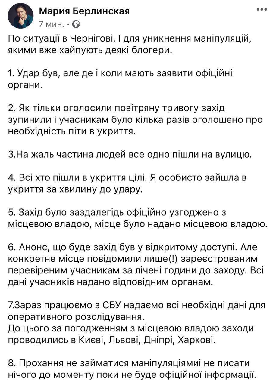 Також вона каже, що як тільки почалася повітряна тривога, виставку припинили. При цьому, з огляду на повідомлення Берлінської, частина учасників виставки від удару постраждала, оскільки після оголошення тривоги пішли не в притулок, а на вулицю.